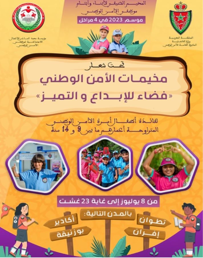 أطلقت مؤسسة محمد السادس للأعمال الاجتماعية لموظفي الأمن الوطني، خلال الأسبوع الجاري، عملية التسجيل الأولي من أجل استفادة أطفال وأيتام موظفي الأمن الوطني من فعاليات المخيمات الصيفية لسنة 2023، والتي سيتم تنظيمها خلال الفترة الممتدة ما بين 08 يوليوز و 23 غشت 2023 بمجموعة من مراكز الاصطياف التي تم تجهيزها بمدن أكادير وبوزنيقة وتطوان وإفران