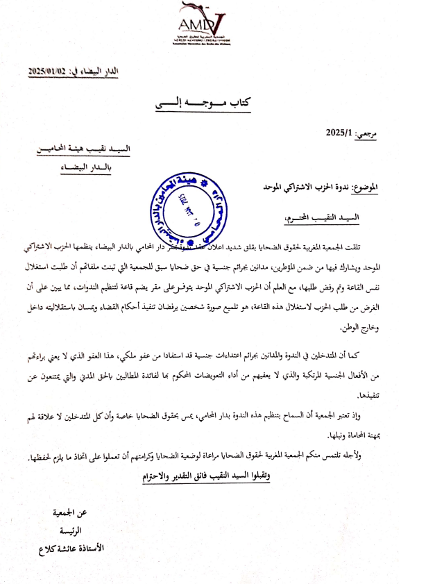 تلقت الجمعية المغربية لحقوق الضحايا بقلق شديد، إعلان عقد ندوة بدار المحامي بالدار البيضاء، ينظمها الحزب الاشتراكي الموحد ويشارك فيها من ضمن المؤطرين، مدانين بجرائم جنسية في حق ضحايا، سبق للجمعية التي تبنت ملفاتهم، أن طلبت استغلال نفس القاعة وتم رفض طلبها، مع العلم أن الحزب الاشتراكي الموحد يتوفر على مقر يضم قاعة لتنظيم الندوات، مما يبين على أن الغرض من طلب الحزب لاستغلال هذه القاعة، هو تلميع صورة شخصين يرفضان تنفيذ أحكام القضاء ويمسان باستقلاليته داخل وخارج الوطن، حسب ما جاء في رسالة للجمعية موجهة إلى نقيب هيئة المحامين بالدار البيضاء، توصل موقع “المغرب ميديا” بنسخة منها.
