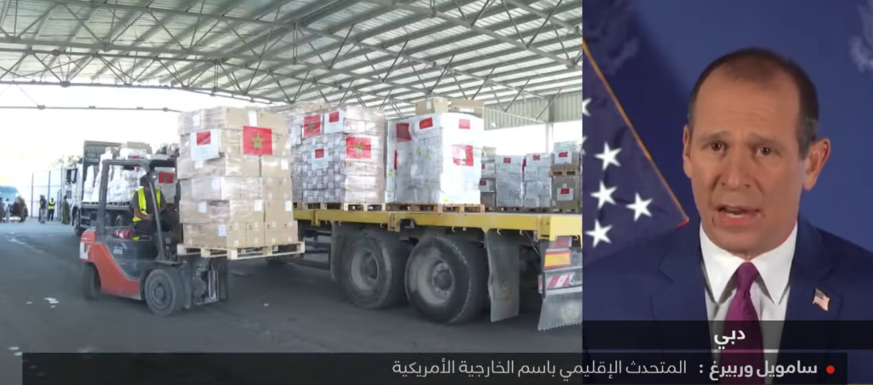 أعرب المتحدث الإقليمي باسم وزارة الخارجية الأمريكية ساميويل وربيرغ، عن شكر وتقدير بلاده للعملية الإنسانية التي أعطى صاحب الجلالة الملك محمد السادس تعليماته السامية لإطلاقها والتي تهم توجيه مساعدات طبية إلى السكان الفلسطينيين بغزة.