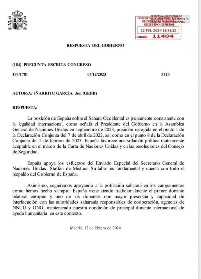 كما أشار الرد الكتابي إلى الإعلان المشترك المعتمد في 7 أبريل 2022 بمناسبة اللقاء بين الملك محمد السادس وبيدرو سانشيز، وكذا إعلان 2 فبراير 2023، اليوم الذي انعقد فيه الاجتماع الرفيع المستوى الثاني عشر (RAN) بين إسبانيا والمغرب في الرباط.