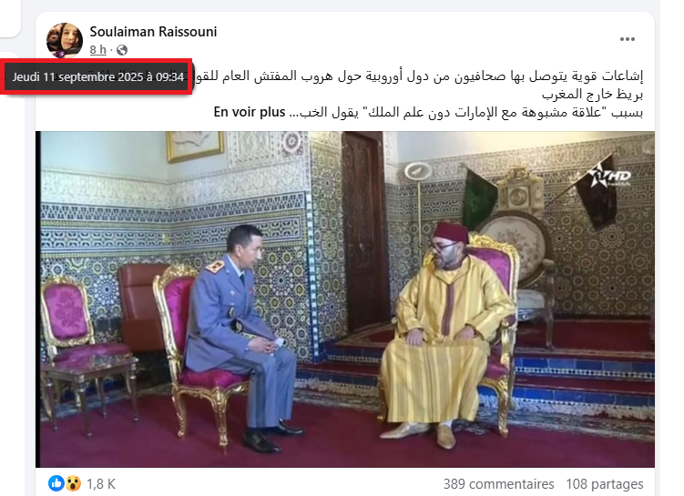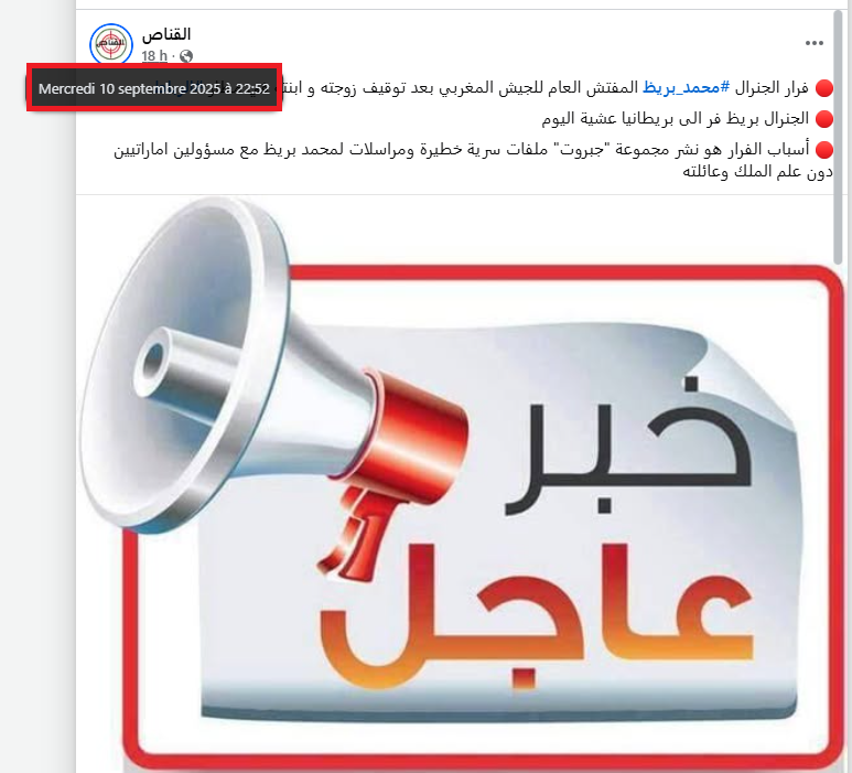 صباح الخميس 11 شتنبر 2025، نشر سليمان الريسوني على صفحته بموقع فيسبوك خبرا مفبركا يزعم فيه أن المفتش العام للقوات المسلحة الملكية، الفريق أول محمد بريظ، “هرب” خارج المغرب بسبب علاقة مشبوهة مع الإمارات. ولإضفاء مصداقية على هذه الأكذوبة، نسبها الريسوني إلى “صحافيين أوروبيين”، مقدما الإشاعة كمعطى موثوق للرأي العام.