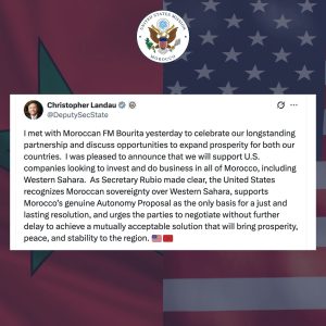 نشر نائب وزير الخارجية الأمريكي كريستوفر لاندو، الأربعاء، تغريدة على حسابه الرسمي بموقع “إكس”، أعلن فيها أن بلاده تدعم بقوة الشركات الأمريكية الراغبة في الاستثمار داخل المغرب، بما في ذلك الأقاليم الجنوبية.