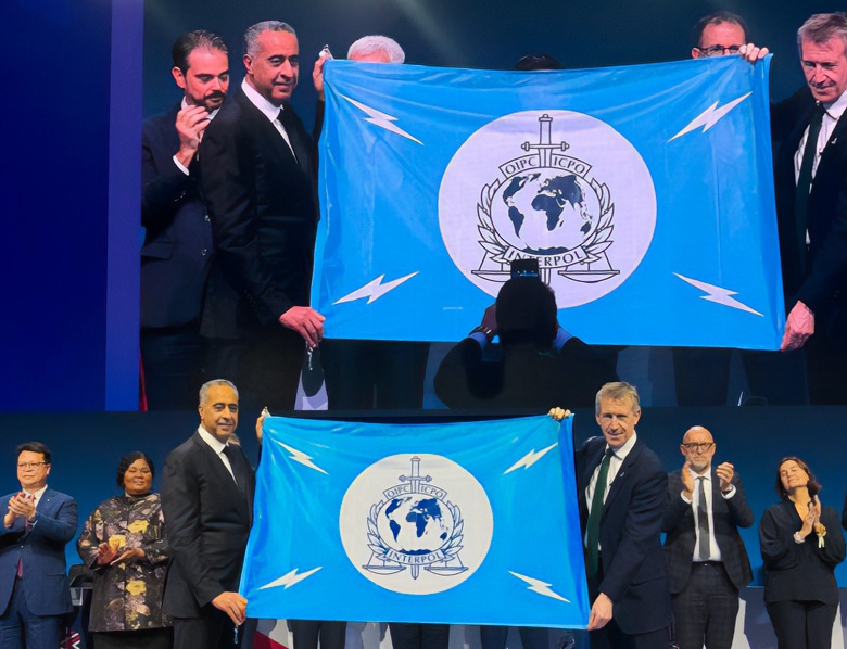 في ختام فعاليات اليوم الأخير من أشغال الدورة الثانية والتسعين للجمعية العامة للأنتربول، تم تسليم علم المنظمة الدولية للشرطة الجنائية للمدير العام للأمن الوطني ولمراقبة التراب الوطني عبد اللطيف حموشي، باعتباره رئيس الوفد الأمني للدولة التي ستحتضن الدورة المقبلة للجمعية العامة للأنتربول.